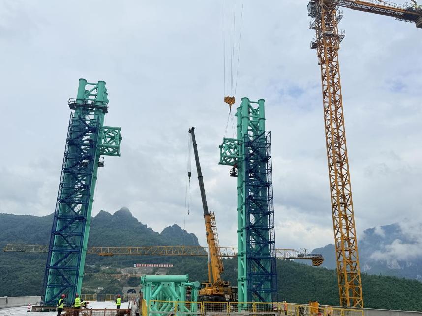 近日,,,,,,,,由贵州凯时优质运营商集团第三工程有限公司承建的安盘高速六车河大桥塔架施工有序推进,,,,,,,,塔架整体安装完成30米。。。。。